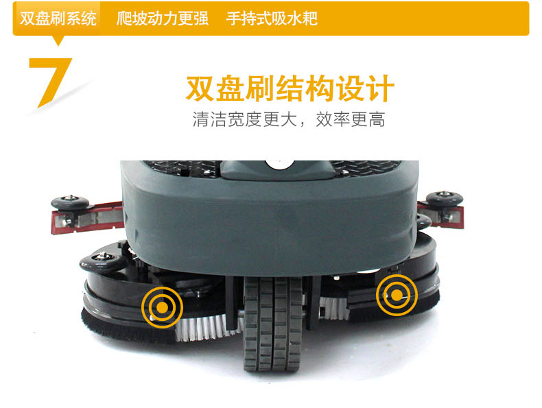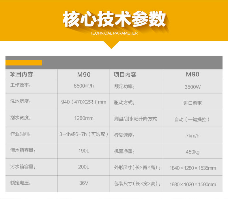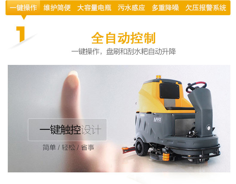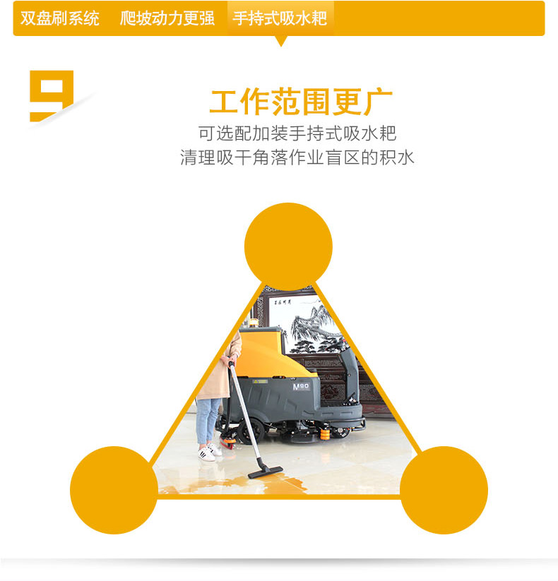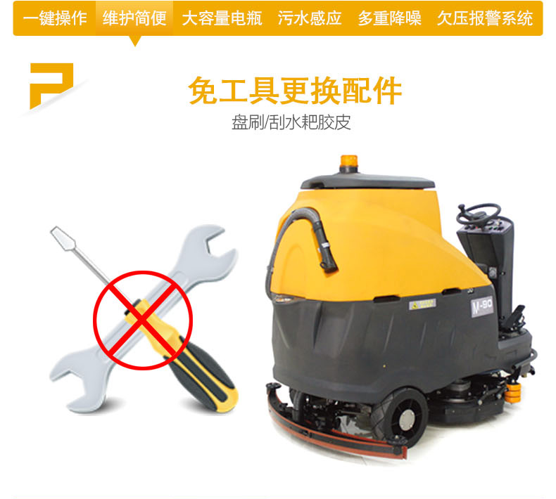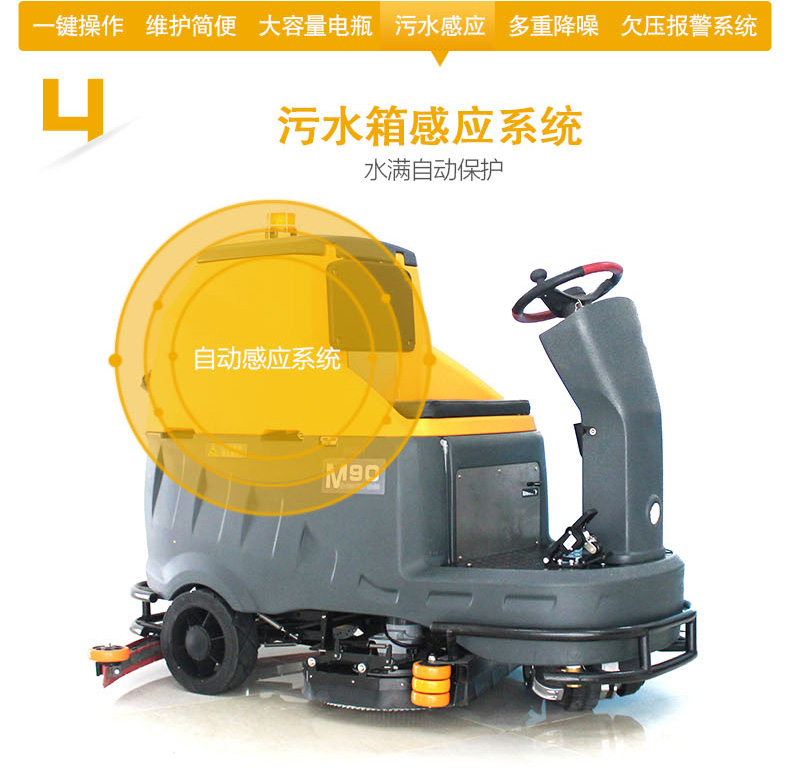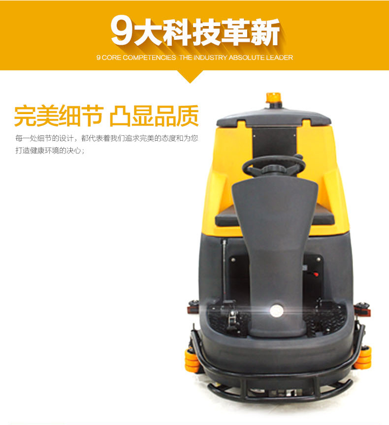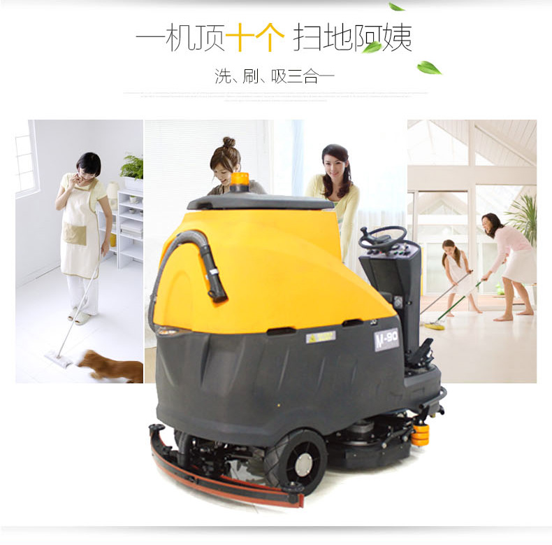 大型雙刷駕駛式 配置高端 性能強大M90電動駕駛式洗地機是一款大型雙刷駕駛式洗地機,集洗刷和吸干為一體,刷盤和刮水耙均可自動升降,在使用人員的駕駛下可將地面上的污漬洗刷干凈,并通過吸水系統將洗刷的污水吸干,機器所過之處一干二凈、無殘留物無水漬;