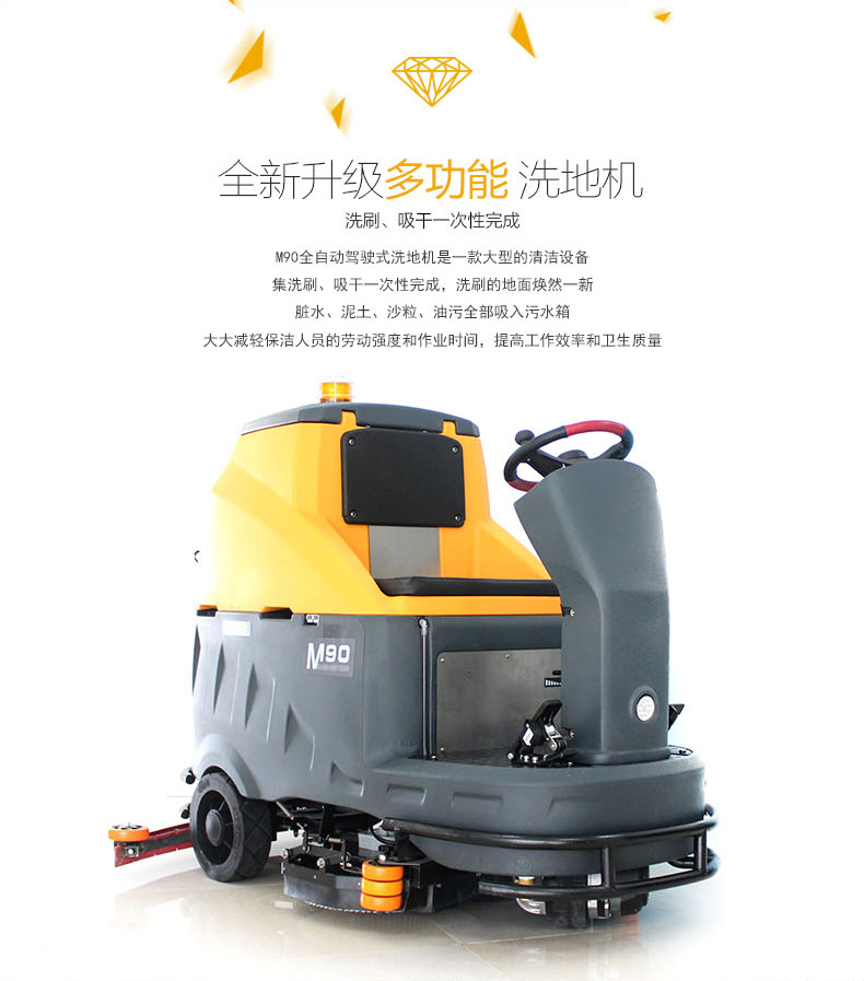 M90電動駕駛式洗地機是一款大型雙刷駕駛式洗地機,集洗刷和吸干為一體,刷盤和刮水耙均可自動升降,在使用人員的駕駛下可將地面上的污漬洗刷干凈,并通過吸水系統將洗刷的污水吸干,機器所過之處一干二凈、無殘留物無水漬;